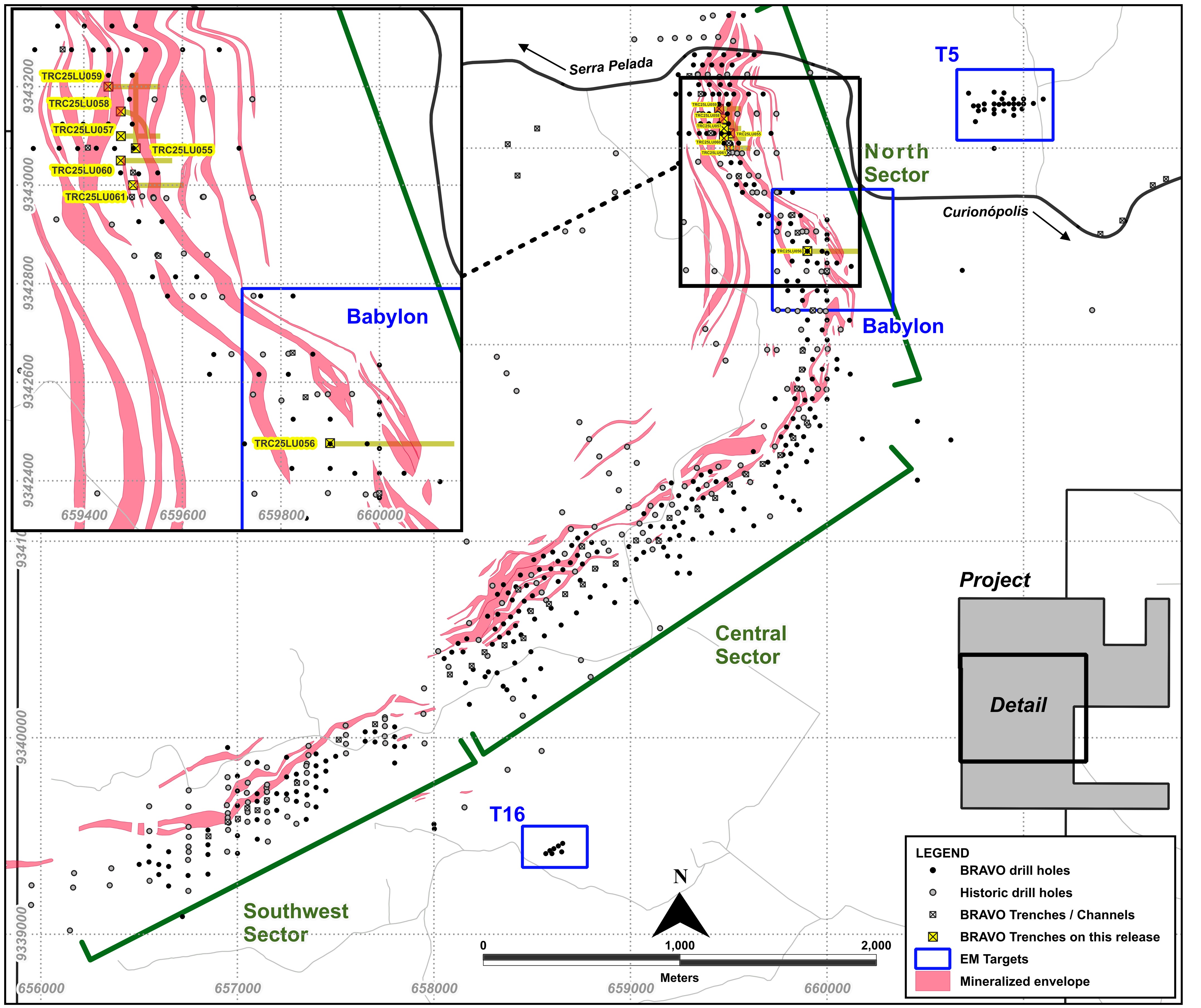 “Trenching has identified the presence of anomalous copper associated with elevated gold values in the North Sector of the Luanga Deposit, which is particularly encouraging, as it may point to later-stage Iron Oxide Copper Gold-style (“IOCG”) mineralization overprinting the PGM mineralization. This emerging copper-gold association supports our broader geological model and aligns with the rationale behind advancing our dedicated copper-gold exploration division, which is now working on an exploration program designed to further define and test Cu-Au targets in 2026,” said Luís Azevedo, Chairman and CEO of Bravo. “At the same time, trenching continues to demonstrate a broader lateral extent of oxide PGM+Au mineralization at surface, including zones with significantly higher grades and particularly elevated gold grades as compared to those previously observed. These consistent results suggest potential to increase the overall volume of oxide mineralization at Luanga. Importantly, the higher-grade zones observed in trenching align with, and in some cases exceed, grades intersected in drill holes at depth in this area.”